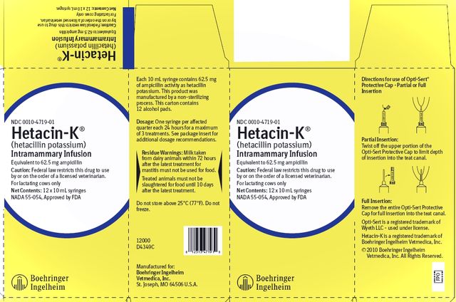 Hetacin-K (hetacillin potassium) Intramammary Infusion is supplied as 10 mL syringes containing 62.5 mg ampicillin activity per syringe. One display carton contains 12 syringes.NDC 0010-4719-01 10 mL syringe