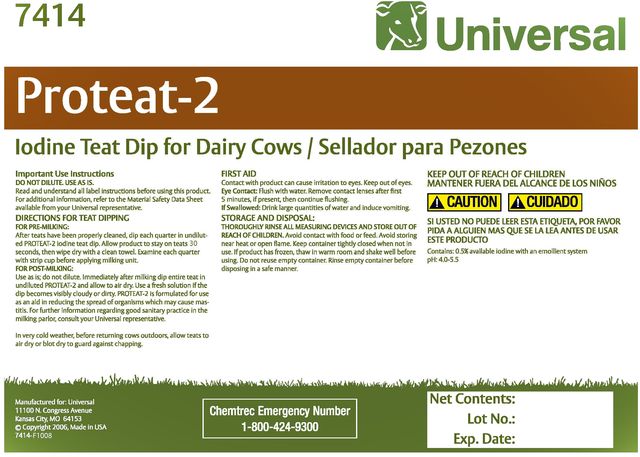 Use as is; do not dilute. Immediately after milking dip entire teat in undiluted PROTEAT-2 and allow to air dry. Use a fresh solution if the dip becomes visibly cloudy or dirty. PROTEAT-2 is formulated for use as an aid in reducing the spread of organisms which may cause mastitis. For further information regarding good sanitary practices in the milking parlor, consult your Universal representative.