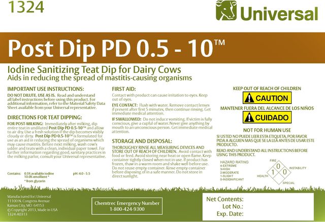 DIRECTIONS FOR TEAT DIPPING: FOR POST-MILKING: Immediately after milking, dip entire teat in undiluted Post Dip PD 0.5-10 and allow to air dry. Use a fresh solution if the dip becomes visibly cloudy or dirty. Post Dip PD 0.5-10 is formulated for use as an aid in reducing the spread of organisms which may cause mastitis. Before next milking, wash cow's udder and teats with a clean, individual paper towel. For further information regarding good, sanitary practices in the milking parlor, consult your Universal representative.